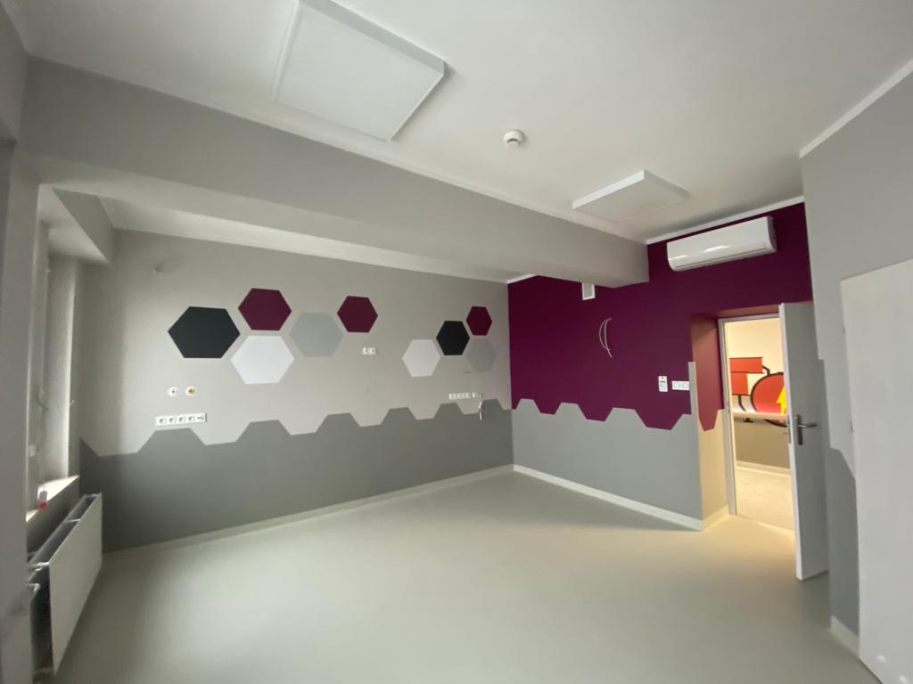 ✔️ Kolory i kształty przyjazne dzieciom i pacjentom - geometryczne wzory (np. heksagony) i kontrastowe barwy pozytywnie wpływają na atmosferę wnętrza.